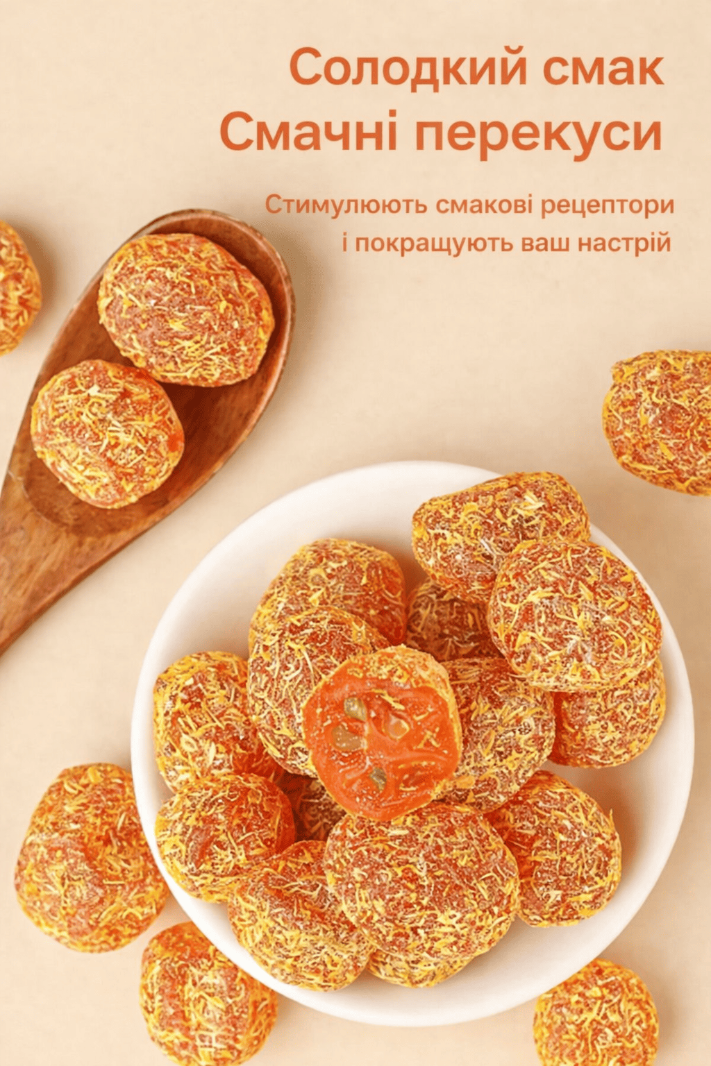Дуже незвичний і приємний смак. Кумкват м’який, соковитий, не пересушений, післясмак довгий і теплий. Добре заходить до чаю, особливо в холодну пору