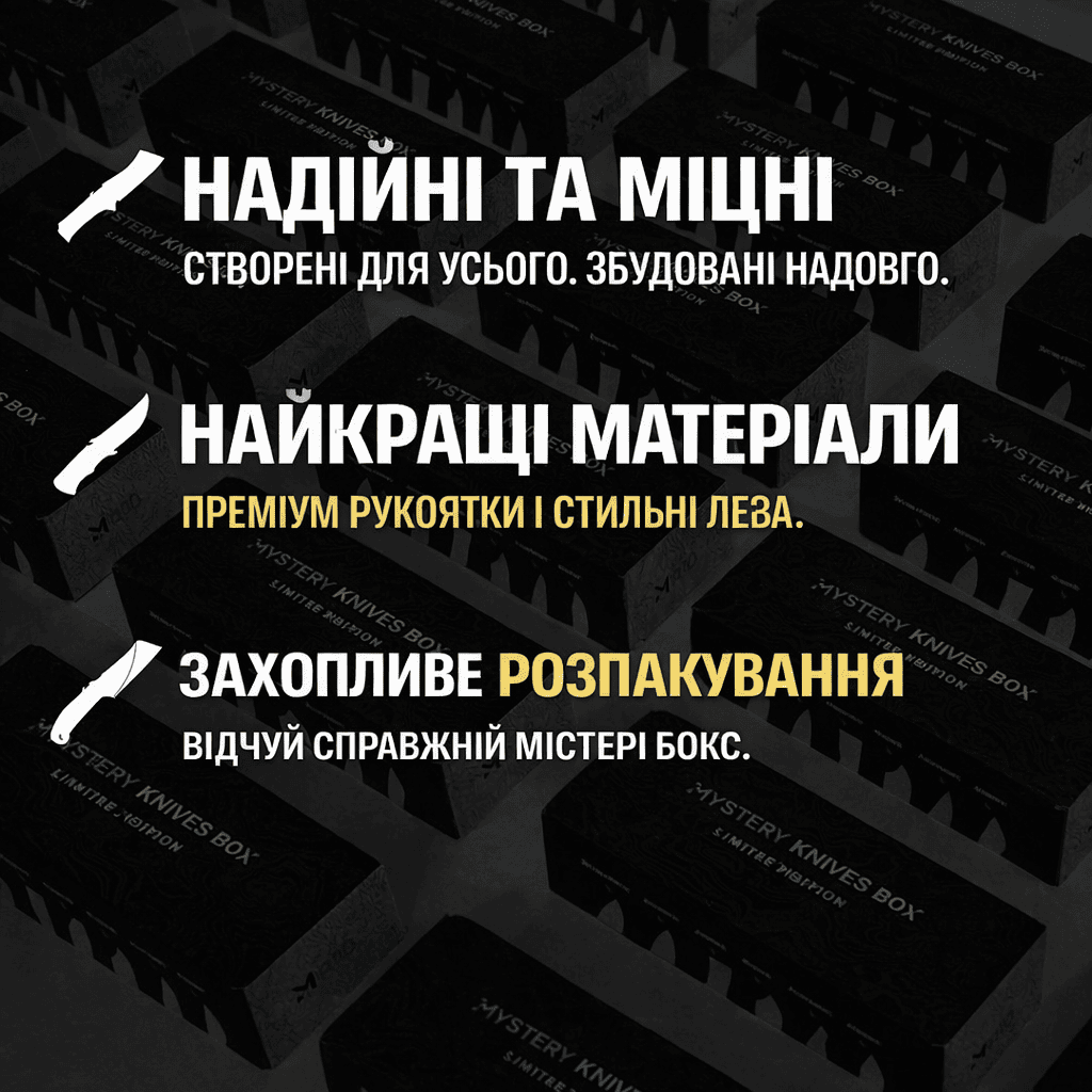 Не очікував такого рівня. У коробці були три абсолютно різні ножі, всі гострі й якісні. Особливо зайшов керамбіт. Пакування топ